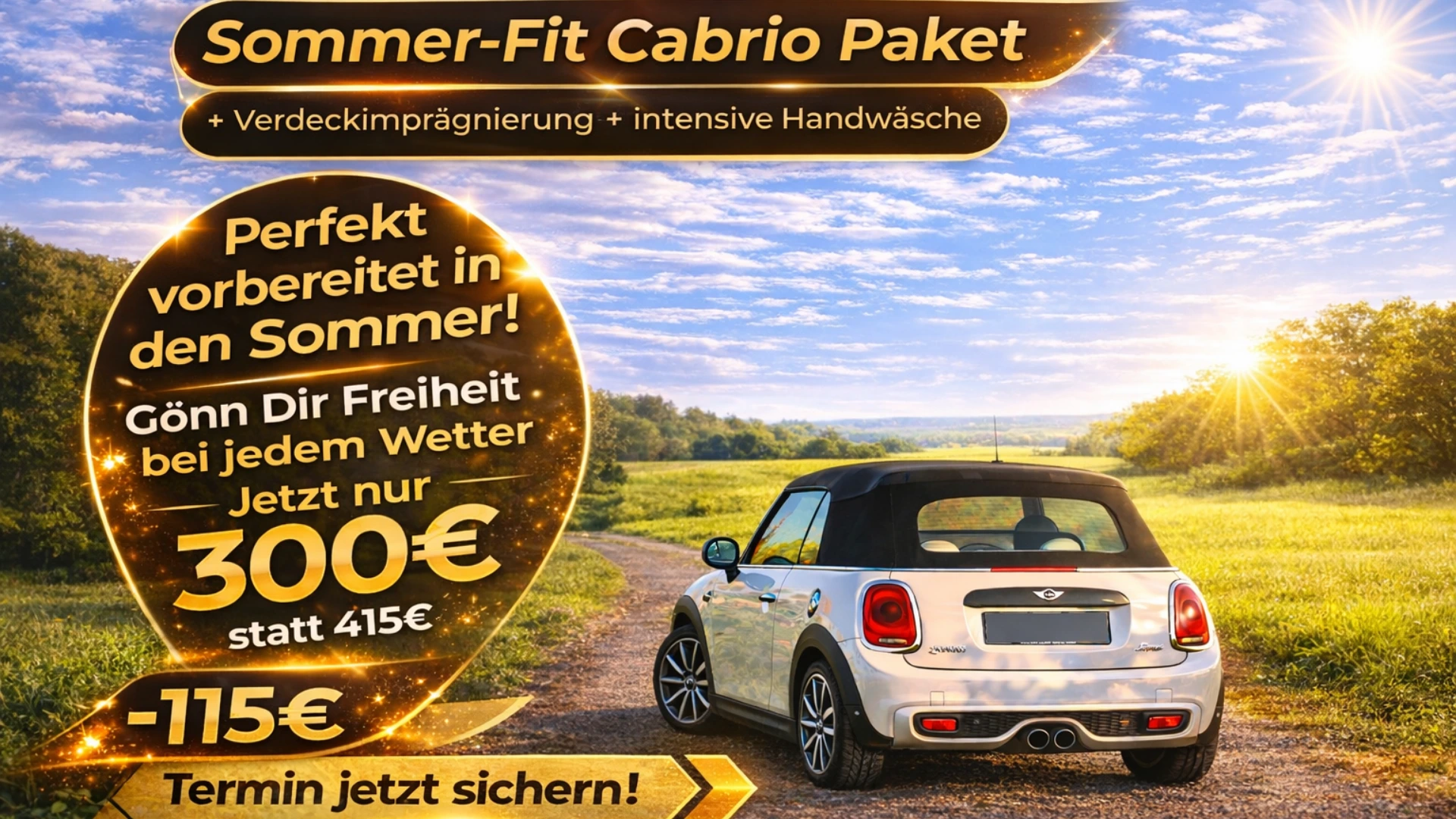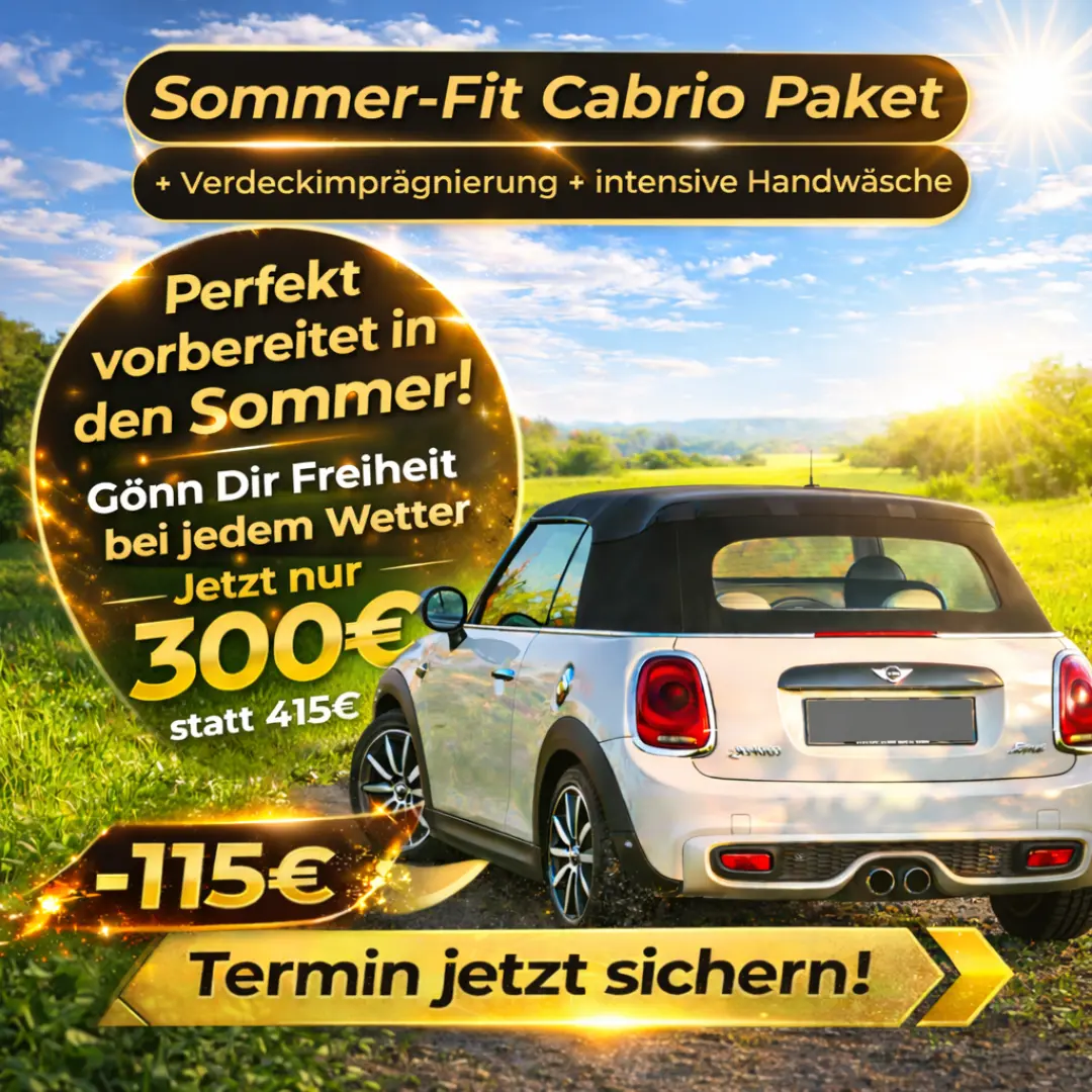 Deshalb gibt’s unser Sommer-Fit Cabrio Paket: Handwäsche + Verdeckimprägnierung damit Dein Cabrio sauber aussieht und das Verdeck besser gegen Wetter & Schmutz geschützt ist.